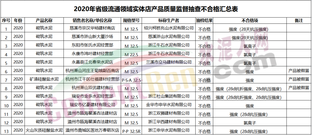 日前,浙江省市場(chǎng)監(jiān)管局發(fā)布《關(guān)于2020年流通領(lǐng)域?qū)嶓w店產(chǎn)品質(zhì)量監(jiān)督抽查情況的通報(bào)》稱(chēng),浙江省市場(chǎng)監(jiān)管局對(duì)2020年以來(lái)流通領(lǐng)域?qū)嶓w店銷(xiāo)售的水泥等14種重點(diǎn)消費(fèi)品開(kāi)展了產(chǎn)品質(zhì)量監(jiān)督抽查,其中抽查的40批次水泥產(chǎn)品中有13批次產(chǎn)品不合格,不合格發(fā)現(xiàn)率為32.50%。具體抽查情況通報(bào)如下: