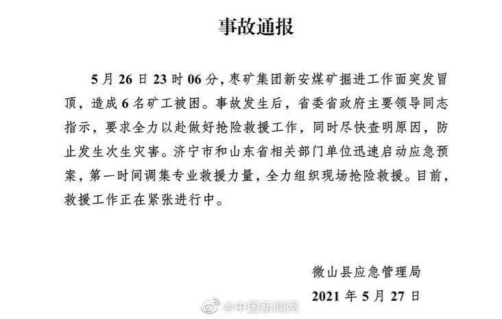 記者從山東省委宣傳部獲悉,5月26日23時(shí)06分,棗礦集團(tuán)新安煤礦突發(fā)冒頂事故,造成6名礦工被困。濟(jì)寧市和山東省相關(guān)部門(mén)單位迅速啟動(dòng)應(yīng)急預(yù)案,第一時(shí)間調(diào)集專業(yè)救援力量,全力組織現(xiàn)場(chǎng)搶險(xiǎn)救援。