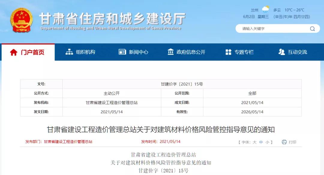 同期,甘肅省建設(shè)工程造價管理總站發(fā)布了關(guān)于對建筑材料價格風(fēng)險管控指導(dǎo)意見的通知(甘建價字〔2021〕15號),建議風(fēng)險幅度宜控制在5%以內(nèi)。