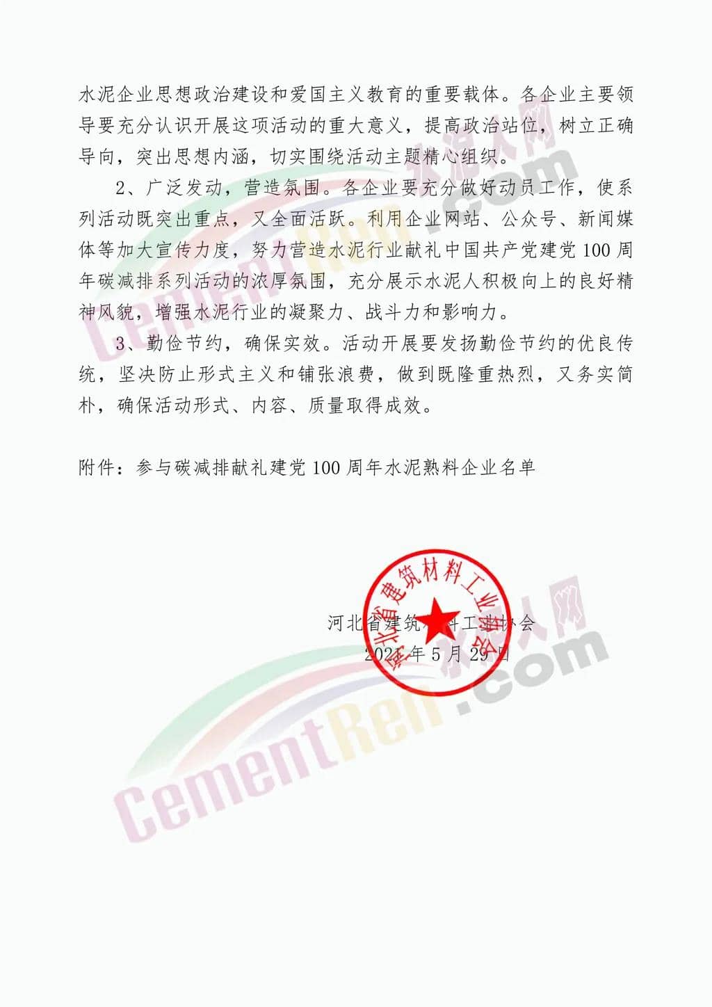 日前,河北省建筑材料工業(yè)協(xié)會(huì)發(fā)布《關(guān)于全省水泥熟料企業(yè)開展獻(xiàn)禮中國共產(chǎn)黨建黨100周年碳減排系列活動(dòng)的通知》給全省水泥熟料企業(yè)稱,依據(jù)相關(guān)文件要求,結(jié)合全省水泥熟料企業(yè)實(shí)際,經(jīng)研究決定在七一前夕組織全省水泥熟料企業(yè)開展獻(xiàn)禮中國共產(chǎn)黨建黨100周年碳減排活動(dòng)。