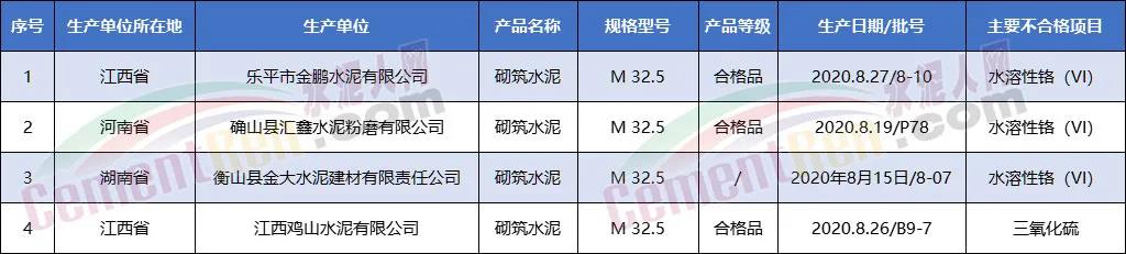 山東聊城通報(bào)1批次水泥產(chǎn)品不合格;西藏自治區(qū)通報(bào)2批次水泥產(chǎn)品質(zhì)量不合格。青海省通報(bào)6批次水泥產(chǎn)品不合格,不合格項(xiàng)目涉及抗壓強(qiáng)度、水溶性鉻(VI);重慶市通報(bào)5批次水泥產(chǎn)品不合格,不合格項(xiàng)目為水溶性鉻、抗壓強(qiáng)度;貴州省通報(bào)1批次產(chǎn)品不合格,不合格項(xiàng)目為燒失量;浙江省通報(bào)13批次不合格;江西省通報(bào)1批次水泥產(chǎn)品不合格。