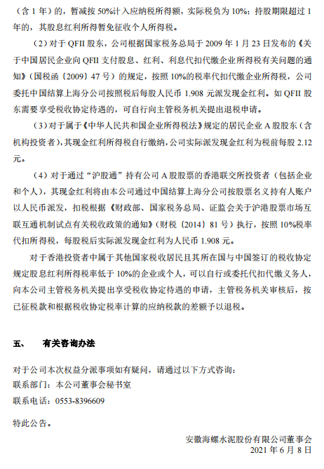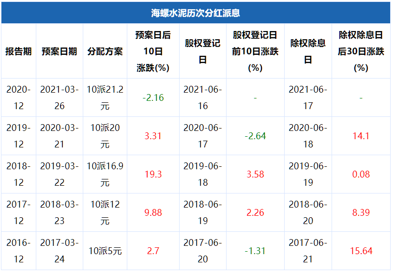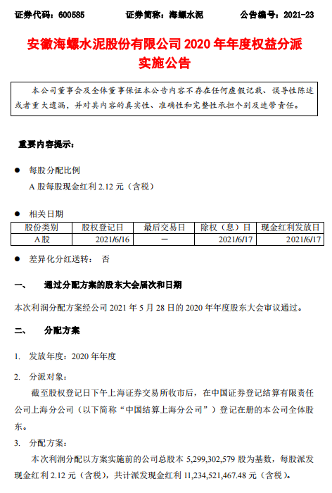 海螺水泥6月9日公布2020年年度分紅實(shí)施方案:以本公司總股本52.99億股為基數(shù),向全體股東每10股派發(fā)現(xiàn)金紅利21.2元(含稅,稅后19.08元),合計(jì)派發(fā)現(xiàn)金紅利總額為112.35億元。