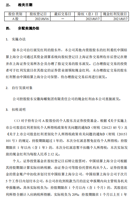 本次權(quán)益分派股權(quán)登記日為2021年6月16日,除權(quán)除息日為2021年6月17日。