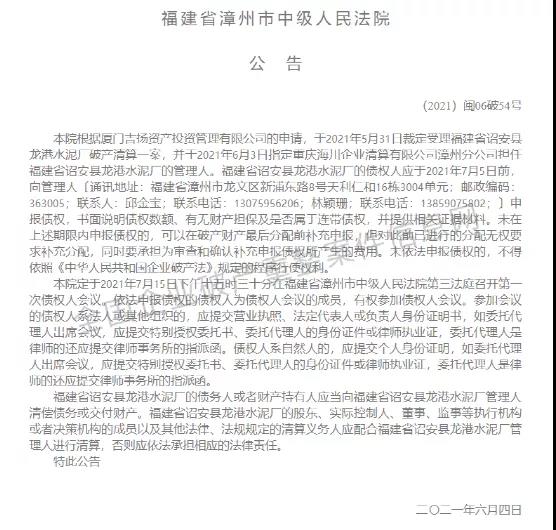 福建省漳州市中級人民法院公告于2021年5月31日裁定受理福建省詔安縣龍港水泥廠破產(chǎn)清算一案,并于2021年6月3日指定重慶海川企業(yè)清算有限公司漳州分公司擔(dān)任福建省詔安縣龍港水泥廠的管理人。