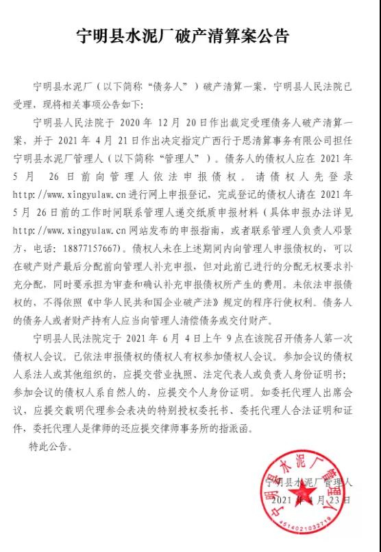 寧明縣水泥廠破產(chǎn)清算案公告提到,寧明縣水泥廠破產(chǎn)清算一案,寧明縣人民法院已受理。寧明縣人民法院于2020年12月20日作出裁定受理債務(wù)人破產(chǎn)清算一案,并于2021年4月21日作出決定指定廣西行于思清算事務(wù)有限公司擔(dān)任寧明縣水泥廠管理人。