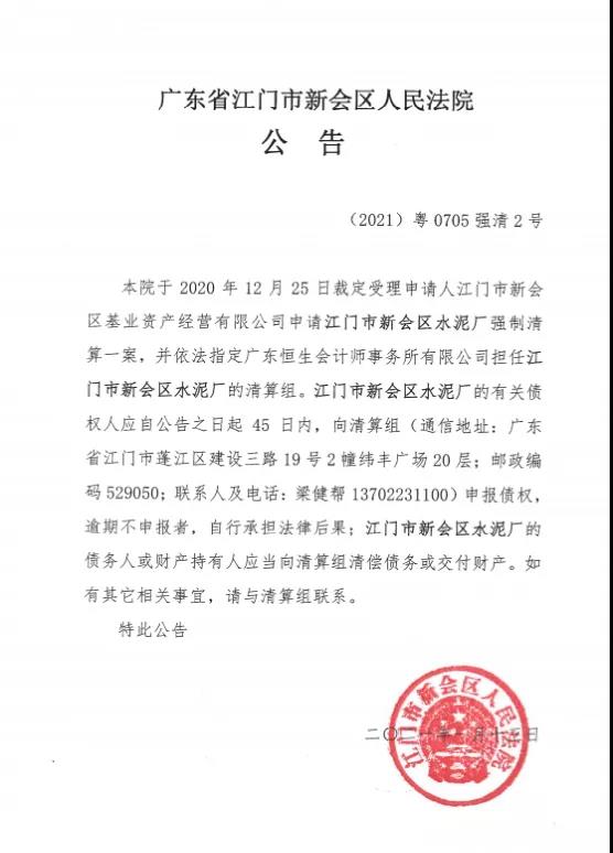 廣東省江門市新會區(qū)人民法院公告,已經(jīng)于2020年12月25日裁定受理申請人江門市新會區(qū)基業(yè)資產(chǎn)經(jīng)營有限公司申請江門市新會區(qū)水泥廠強(qiáng)制清算一案,并依法指定廣東恒生會計師事務(wù)所有限公司擔(dān)任江門市新會區(qū)水泥廠的清算組。