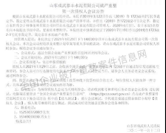 山東成武泰豐水泥有限公司破產(chǎn)重整第一次債權(quán)會議公告顯示,根據(jù)企業(yè)申請,山東省成武縣人民法院于2019年3月22日裁定受理企業(yè)破產(chǎn)清算申請,并作出決定書指定山東牡丹會計事務(wù)所有限公司擔(dān)任企業(yè)管理人。