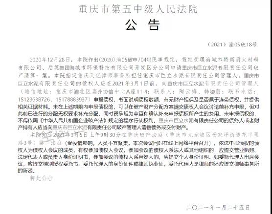 重慶第五中級人民法院公告,2020年12月28日,裁定刯海城市特新耐火材料有限公司、后英集團(tuán)海城市環(huán)保科技有公司開發(fā)區(qū)分公布申請重慶市巨立水泥有限公司破產(chǎn)清算案,指定重慶天億律師事務(wù)所擔(dān)任重慶市巨立水泥有限責(zé)任管理人。