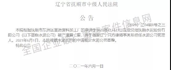 遼寧扶省撫順市中級人民法院公司,于2020年11月23日裁定受理撫順?biāo)喙煞萦邢薰酒飘a(chǎn)清算一案,并指定遼寧同方律師事務(wù)所擔(dān)任水泥公司管理人。