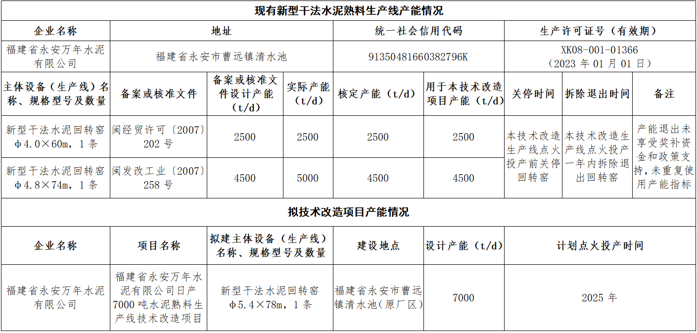 日產(chǎn)7000噸水泥熟料生產(chǎn)線技術(shù)改造項目產(chǎn)能情況表