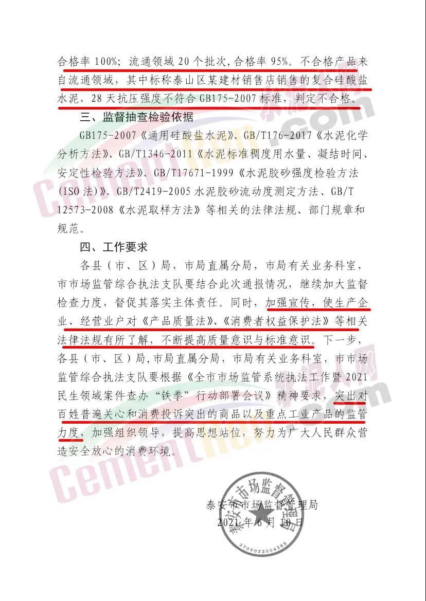 日前,山東省泰安市市場監(jiān)督管理局發(fā)布關于2021年度生產(chǎn)、流通領域水泥商品質(zhì)量市級專項監(jiān)督抽查情況的通報。