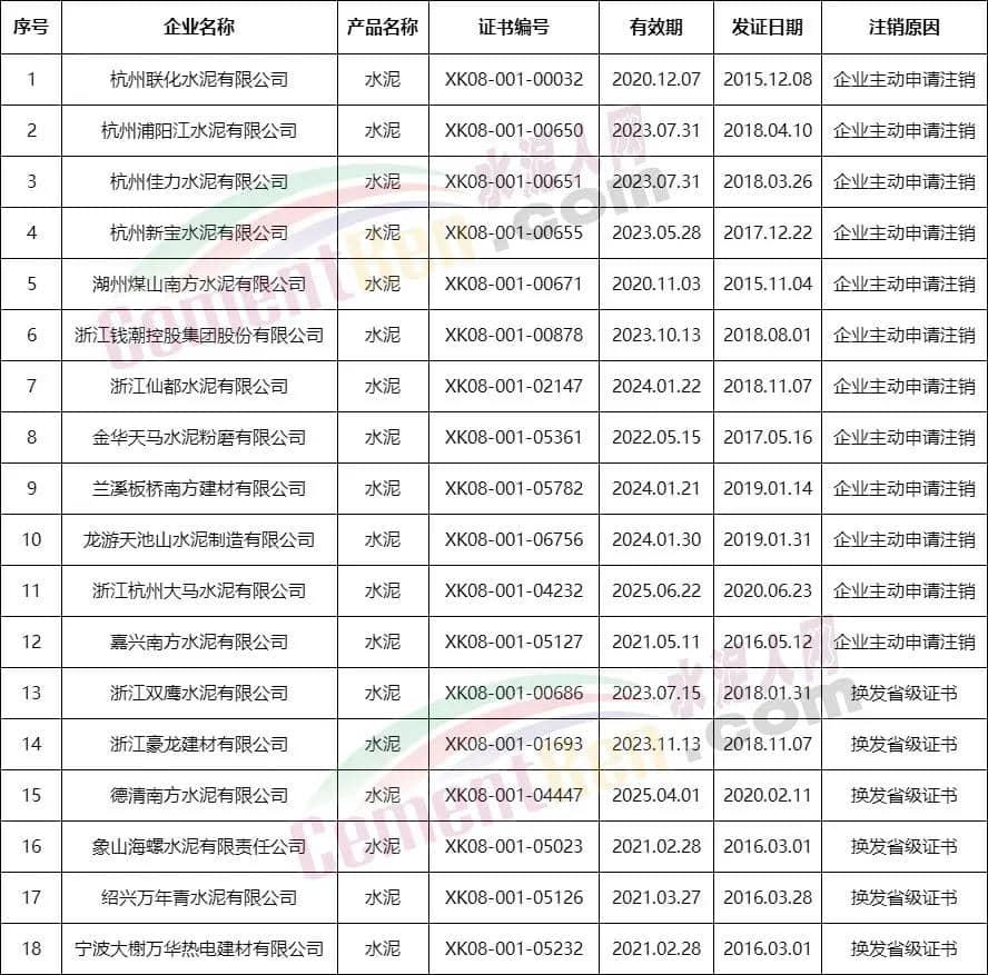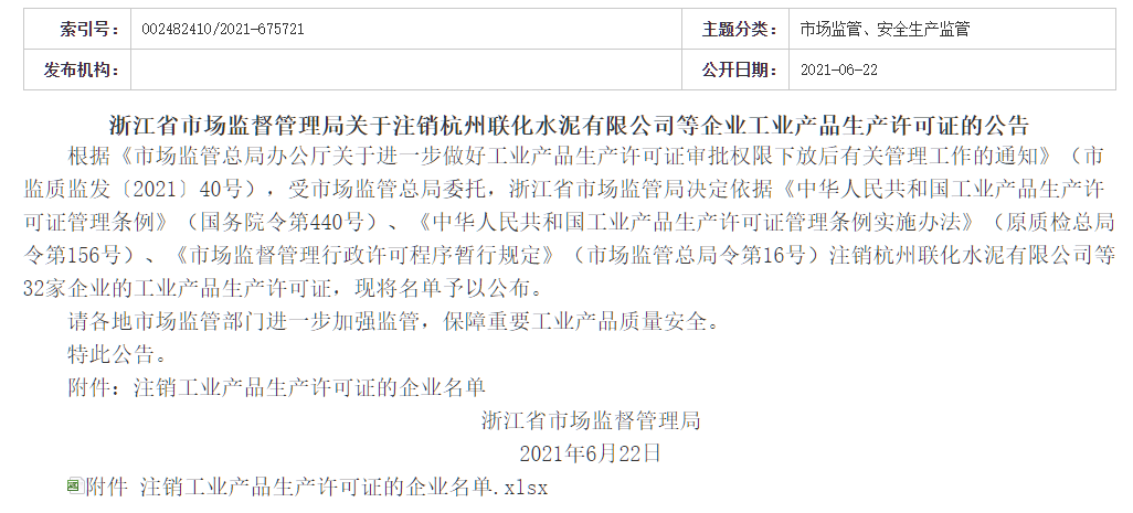 2021年6月22日,浙江省市場監(jiān)督管理局網(wǎng)站發(fā)布關(guān)于注銷杭州聯(lián)化水泥有限公司等企業(yè)工業(yè)產(chǎn)品生產(chǎn)許可證的公告。其中包括12家企業(yè)生產(chǎn)許可證企業(yè)主動申請注銷,6家企業(yè)換發(fā)省級證書。