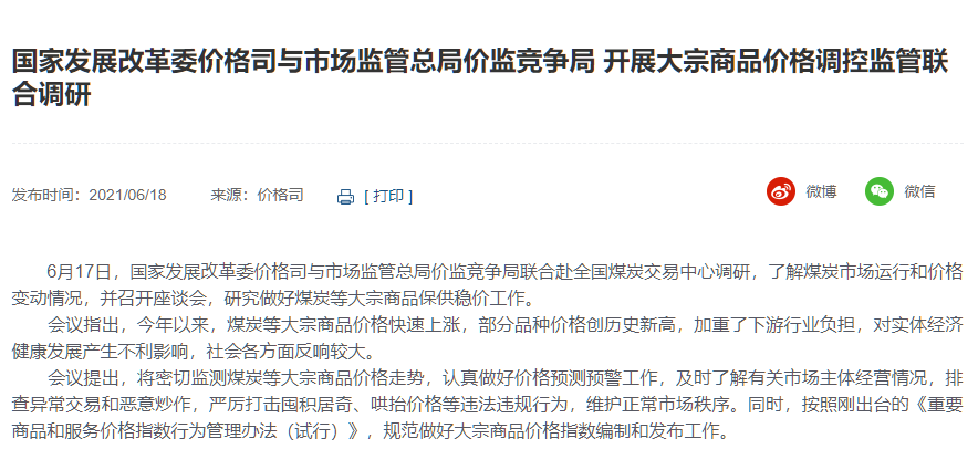 國(guó)家發(fā)改委發(fā)布:6月17日,國(guó)家發(fā)展改革委價(jià)格司與市場(chǎng)監(jiān)管總局價(jià)監(jiān)競(jìng)爭(zhēng)局派出多個(gè)聯(lián)合工作組,赴有關(guān)省市就大宗商品保供穩(wěn)價(jià)問(wèn)題進(jìn)行調(diào)查。工作組將詳細(xì)了解有關(guān)企業(yè)參與大宗商品期現(xiàn)貨市場(chǎng)交易情況,認(rèn)真聽(tīng)取中下游企業(yè)對(duì)上游供貨數(shù)量和價(jià)格變化情況的反映以及打擊投機(jī)炒作、保障市場(chǎng)供應(yīng)的建議,聽(tīng)取有關(guān)專家、市場(chǎng)機(jī)構(gòu)對(duì)加強(qiáng)期現(xiàn)貨市場(chǎng)聯(lián)動(dòng)監(jiān)管、維護(hù)市場(chǎng)正常秩序的意見(jiàn)。