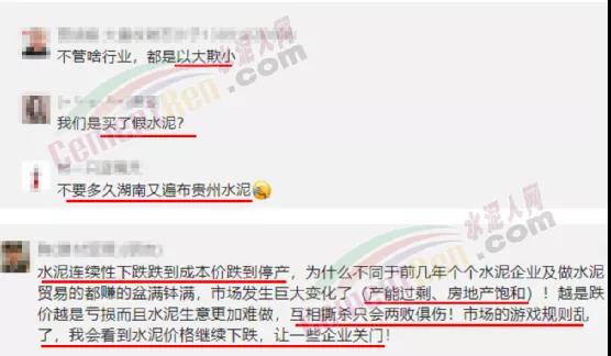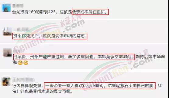 對于臺泥大幅度降價情況,市場中存在各種聲音,有人稱臺泥執(zhí)行的是“市場競爭”,其他企業(yè)則是“價格戰(zhàn)”;也是有人說臺泥是低于成本價在“血拼”;這是白菜價,貴州產(chǎn)能嚴重過剩,疊加多重因素,本輪競爭空前激烈,期待后續(xù)市場調(diào)整;都是被逼的,區(qū)域過剩嚴重,而且在臺泥之前,其他企業(yè)早就這么做了。