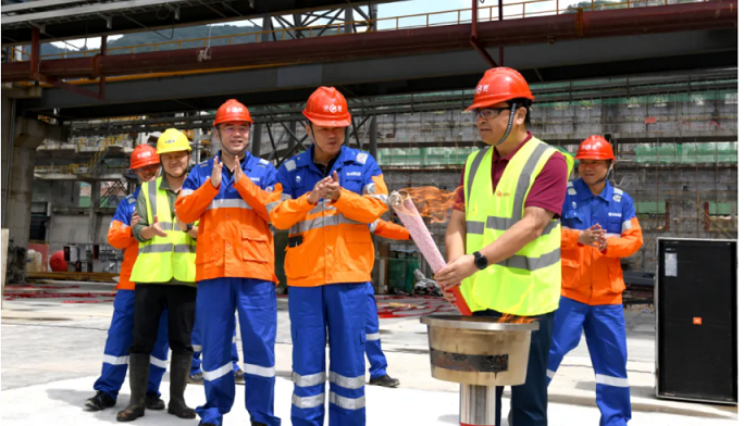 華新公司黨委書記、總裁李葉青為華新設(shè)計(jì)制造的全套國(guó)產(chǎn)化設(shè)備萬噸線投產(chǎn)點(diǎn)火