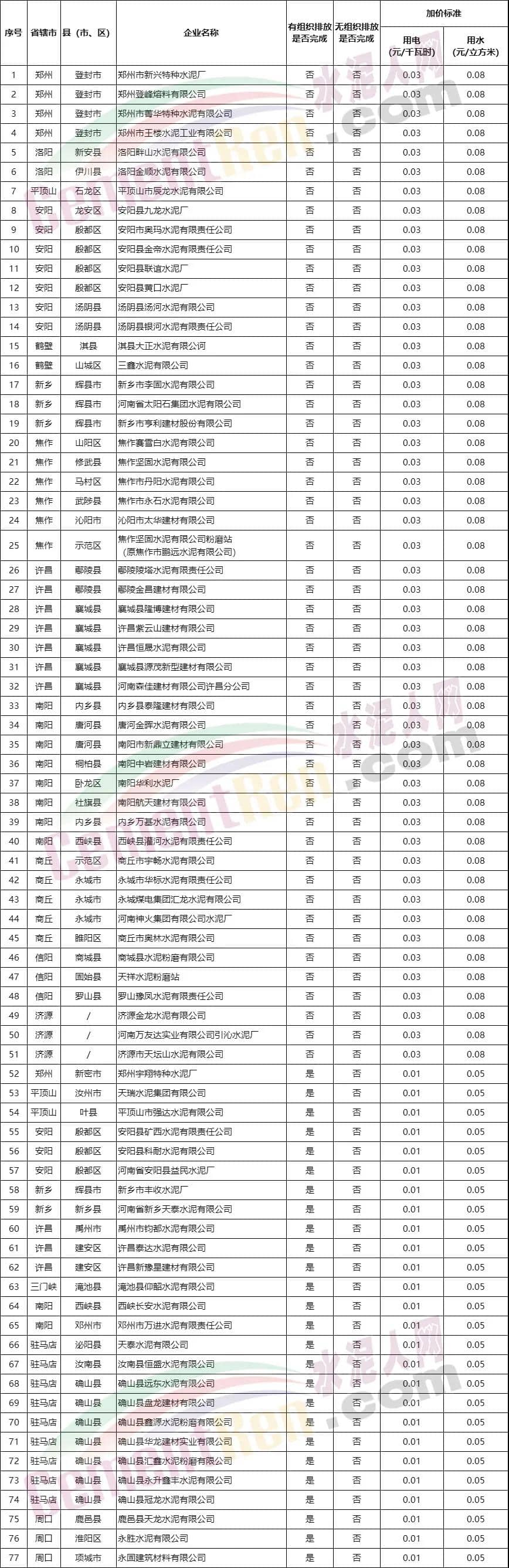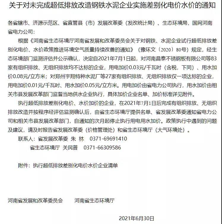 水泥企業(yè)實施差別化電價水價的通知》。根據(jù)通知,河南省發(fā)改委決定自2021年7月1日起,對河南昌泰不銹鋼板有限公司等83家有組織排放、無組織排放均不達標的企業(yè),用電加價0.03元/千瓦時、用水加價0.08元/立方米;對鄭州宇翔特種