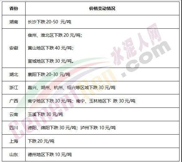 據(jù)水泥人網(wǎng)此前報(bào)道,上周內(nèi)浙江、安徽、上海、山東、廣西、湖南、湖北、云南、四川等多區(qū)域下調(diào)水泥價(jià)格10-50元/噸,其中湖南長(zhǎng)沙個(gè)別企業(yè)一次性下調(diào)50元/噸。