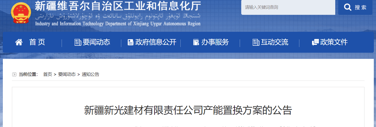 按照《國務院辦公廳關于促進建材工業(yè)穩(wěn)增長調(diào)結構增效益的指導意見》(國辦發(fā)〔2016〕34號)、《工業(yè)和信息化部關于印發(fā)鋼鐵水泥玻璃行業(yè)產(chǎn)能置換實施辦法的通知》(工信部原〔2017〕337號)、《工業(yè)和信息化部辦公廳國家發(fā)展改革委辦公廳關于嚴肅產(chǎn)能置換嚴禁水泥平板玻璃行業(yè)新增產(chǎn)能的通知》(工信廳聯(lián)原〔2018〕57號)、《水泥玻璃行業(yè)產(chǎn)能置換實施辦法操作問答》要求,新疆維吾爾自治區(qū)工信廳于2021年6月1日至6月9日對《新疆新光建材有限責任公司產(chǎn)能置換方案》進行了公示,公示期間異議問題已得到處理?,F(xiàn)將《新疆新光建材有限責任公司產(chǎn)能置換方案》予以公告,置換項目的生產(chǎn)線在新建項目投產(chǎn)前需完成拆除。