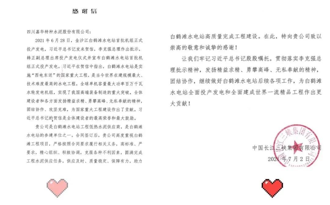 7月5日,中國建材集團(tuán)所屬中國建筑材料科學(xué)研究總院有限公司(以下簡稱“中國建材總院”)和嘉華特種水泥股份有限公司(以下簡稱“嘉華水泥”),分別收到了來自白鶴灘水電站開發(fā)建設(shè)方中國長江三峽集團(tuán)有限公司的感謝信。