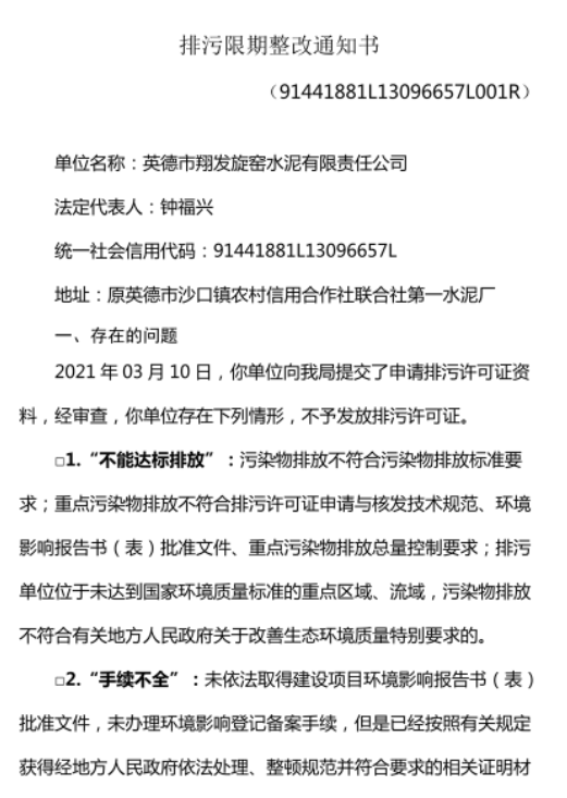 其中,今年3月30日下達(dá)限期整改的廣東清遠(yuǎn)英德市翔發(fā)旋窯水泥有限責(zé)任公司整改問題為“未按規(guī)定對廢氣進(jìn)行收集處理、未進(jìn)行無組織排放控制要求、其他-未按規(guī)定設(shè)置污染物排放口、未完成自主驗(yàn)收手續(xù)”等。企業(yè)整改措施、整改計(jì)劃如下: