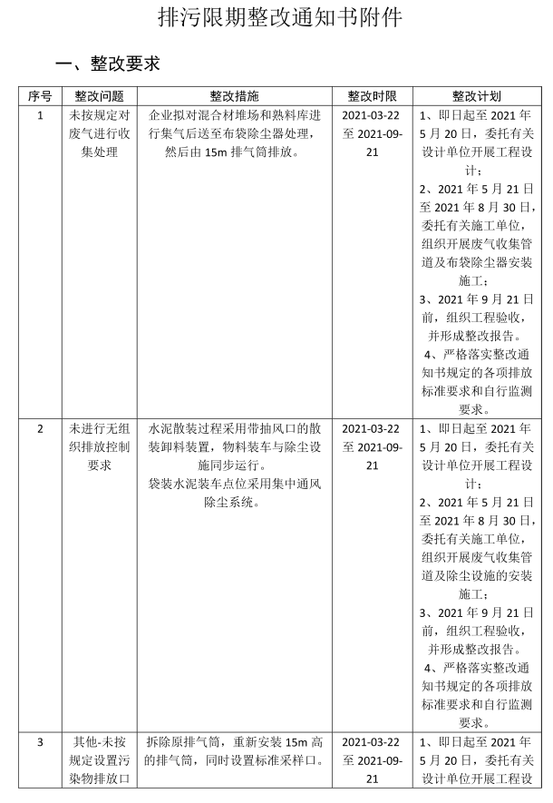 1、即日起至2021年9月1日,按期完成環(huán)保工程整改;