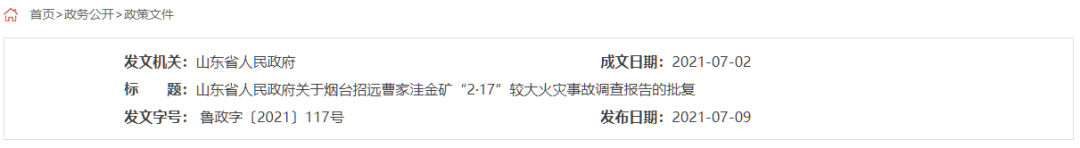 據(jù)山東省政府網(wǎng)站7月9日消息,山東省人民政府發(fā)布關(guān)于煙臺招遠曹家洼金礦“2·17”較大火災(zāi)事故調(diào)查報告的批復。2021年2月17日6時許,山東煙臺招遠市夏甸鎮(zhèn)曹家洼金礦在設(shè)備檢修時發(fā)生火災(zāi)。截至2月17日17時,井下搜救工作結(jié)束。此次事故共造成6人遇難,4人成功升井。