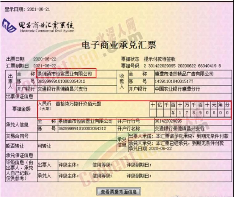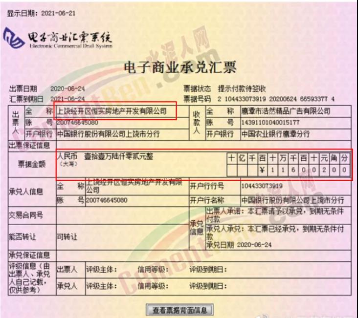 2021年6月22日,由江西恒大地產(chǎn)簽發(fā)的商業(yè)承兌匯票多張到期不兌付,景德鎮(zhèn)市恒宸置業(yè)、景德鎮(zhèn)德泰房地產(chǎn)、上海經(jīng)開區(qū)恒實房地產(chǎn)均存在未兌付票據(jù)共計46.3萬元,商戶愿意接受恒大的票據(jù)是對恒大的信任,然而事實卻是這份難得的信任也遭到了踐踏。