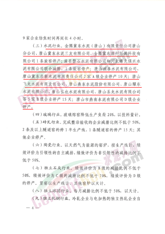 唐山飛龍水泥有限責(zé)任公司、唐山燕東水泥股份有限公司、唐山耀東水泥有限公司、唐山弘也水泥有限公司、唐山圣龍水泥有限公司等5家B級(jí)企業(yè)停產(chǎn)15天;