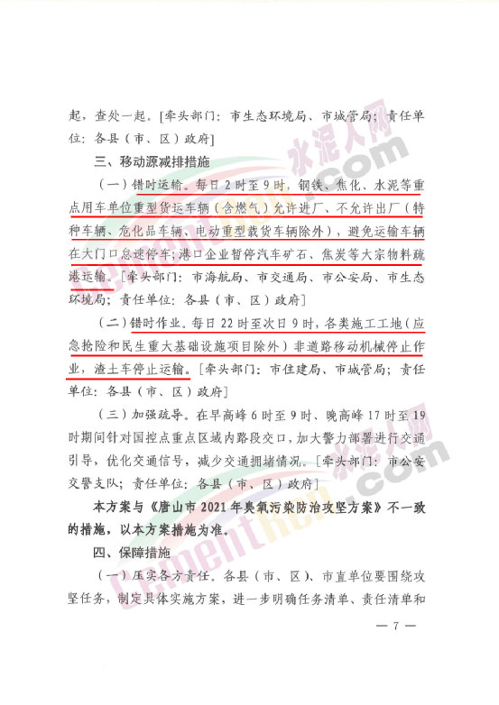 移動(dòng)源減排措施要求錯(cuò)時(shí)運(yùn)輸、錯(cuò)時(shí)作業(yè)。每日2時(shí)至9時(shí),鋼鐵、焦化、水泥等重點(diǎn)用車(chē)單位重型貨運(yùn)車(chē)輛允許進(jìn)廠、不允許出廠,避免運(yùn)輸車(chē)輛在大門(mén)口怠速停車(chē);港口企業(yè)暫停汽車(chē)礦石、焦炭等大宗物料疏港運(yùn)輸;每日22時(shí)至次日9時(shí),各類(lèi)施工工地非道路移動(dòng)機(jī)械停止作業(yè),渣土車(chē)停止運(yùn)輸。