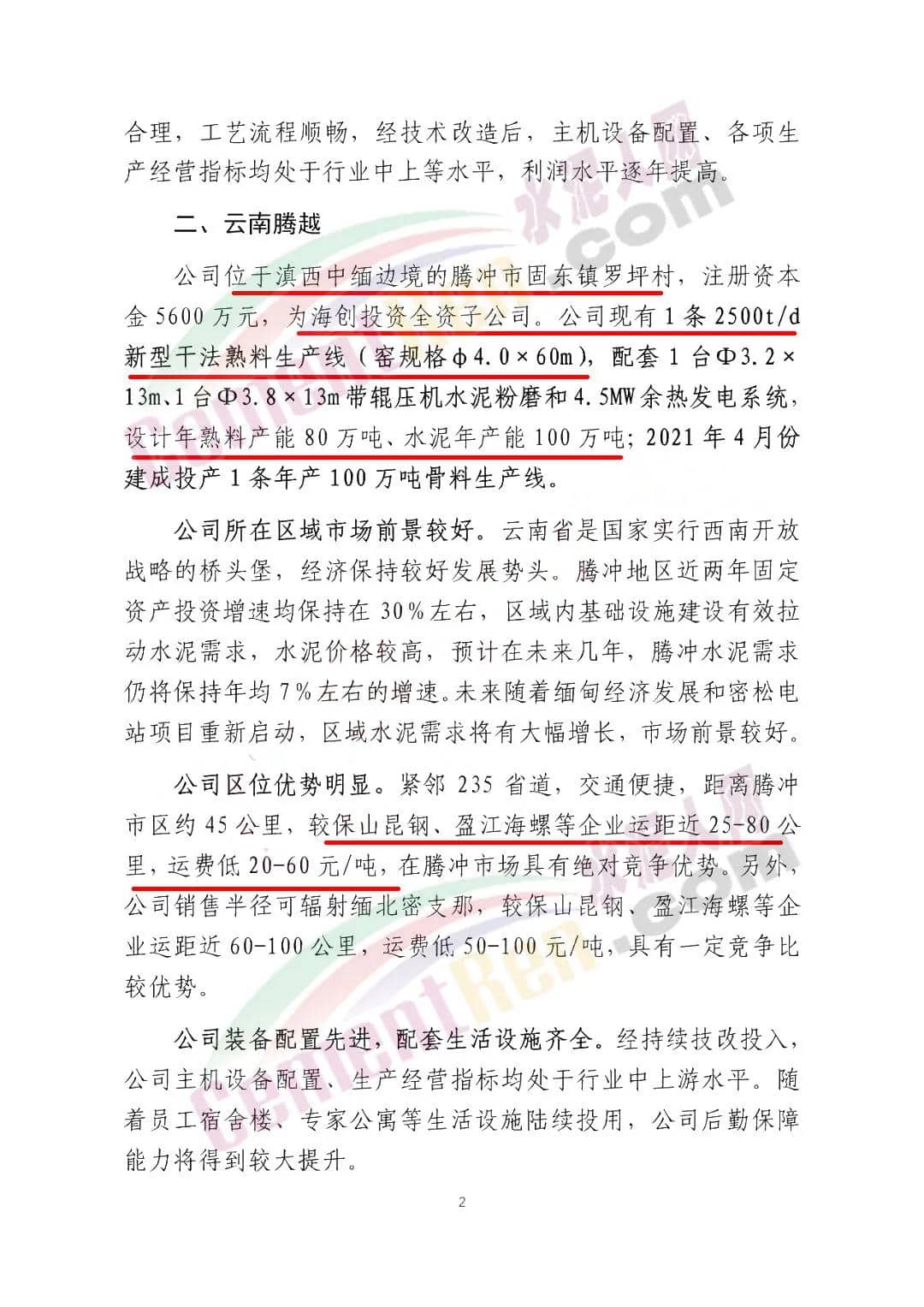 《情況介紹》提到安徽海螺創(chuàng)業(yè)投資有限責(zé)任公司旗下?lián)碛匈F州新雙龍水泥有限公司、騰沖市騰越水泥有限公司2家水泥公司,經(jīng)股東協(xié)商達成一致,擬將其下屬的貴州新雙龍和云南騰越100%股權(quán)公開對外出售或轉(zhuǎn)讓。