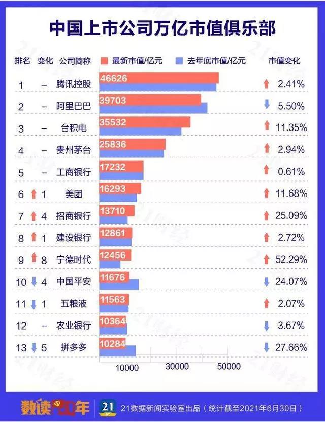 日前,21數(shù)據(jù)新聞實(shí)驗(yàn)室發(fā)布統(tǒng)計(jì)數(shù)據(jù),截止2021年6月30日,中國市值500強(qiáng)公司合計(jì)總市值達(dá)98.78萬億,較年初增長約6%,貢獻(xiàn)了所有中國公司市值的66.48%。其中千億市值公司254家,13家公司市值超萬億元,騰訊控股、阿里巴巴、臺(tái)積電穩(wěn)居前三。