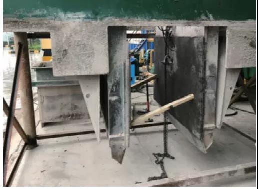 更換過(guò)程中,發(fā)現(xiàn)復(fù)合輥輥面兩端大約有50mm長(zhǎng)沒有磨損,說(shuō)明兩端50mm長(zhǎng)沒有做功。所以,更換新型鑄釘輥前,把接料裝置耐磨板兩端各增加50mm長(zhǎng)度,提高輥壓機(jī)功效。