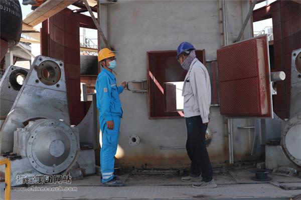 錢(qián)宣紅(左一)與監(jiān)理檢查原料磨安裝質(zhì)量