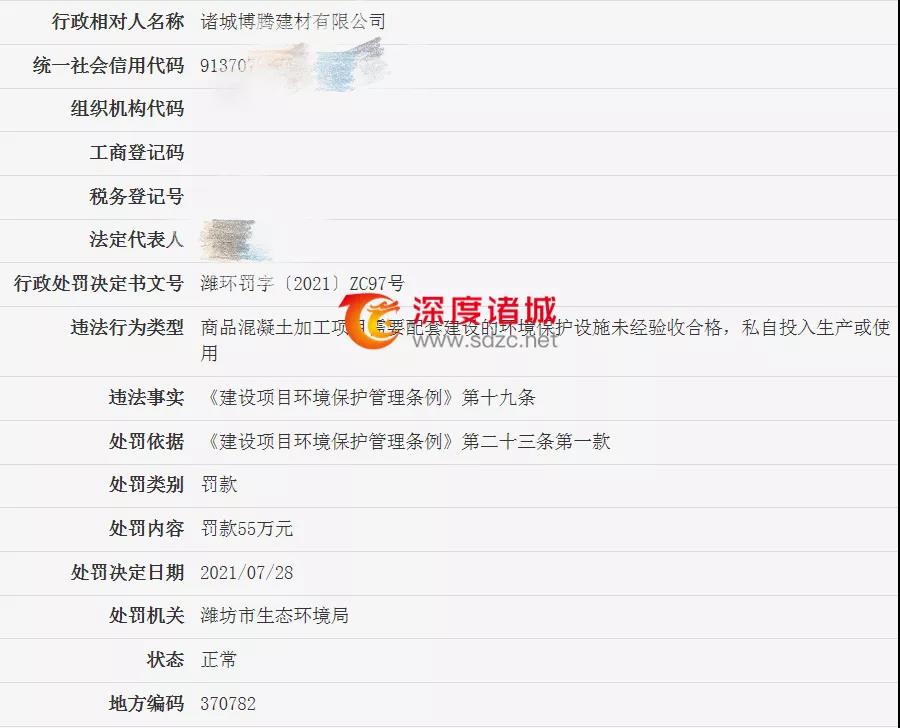 諸城市楊春水泥有限公司馬莊分公司被罰48.75萬元