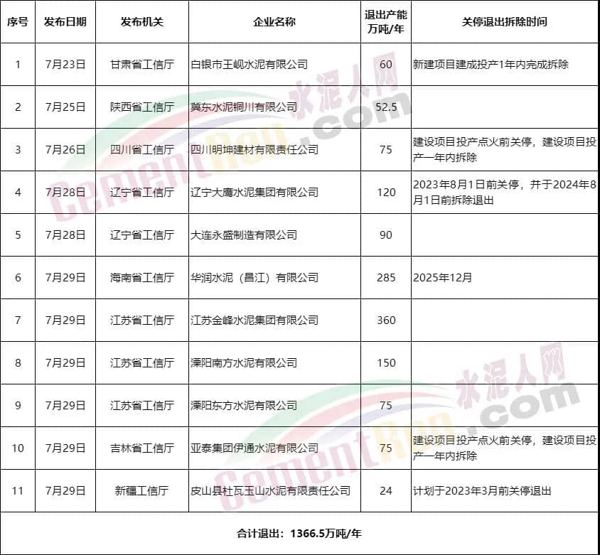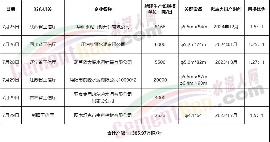 為趕上產(chǎn)能置換“紅利”的末班車(chē),從7月23日至7月29日,甘肅、陜西、四川、遼寧、江蘇、吉林、海南、新疆等多省、自治區(qū)工信部門(mén)集中發(fā)布水泥熟料生產(chǎn)線拆除退出以及新建生產(chǎn)線置換公示、公告消息。
