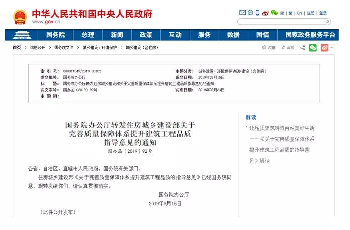 2019年國(guó)務(wù)院辦公廳發(fā)布了關(guān)于完善質(zhì)量保障體系提升建筑工程品質(zhì)指導(dǎo)意見(jiàn),明確要求,推進(jìn)工程質(zhì)量管理標(biāo)準(zhǔn)化,將質(zhì)量管理要求落實(shí)到每個(gè)項(xiàng)目和員工。建立質(zhì)量責(zé)任標(biāo)識(shí)制度,對(duì)關(guān)鍵工序、關(guān)鍵部位隱蔽工程實(shí)施舉牌驗(yàn)收,加強(qiáng)施工記錄和驗(yàn)收資料管理,實(shí)現(xiàn)質(zhì)量責(zé)任可追溯。