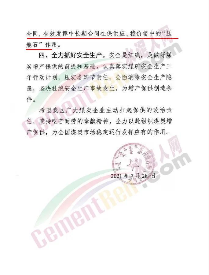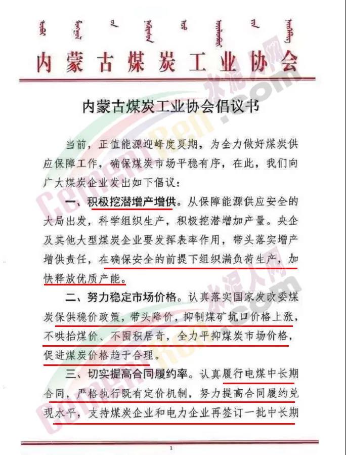 7月28日內(nèi)蒙古煤炭工業(yè)協(xié)會(huì)發(fā)布倡議書(shū)稱,當(dāng)前,正值能源迎峰度夏期,為全力做好煤炭供應(yīng)保障工作,確保煤炭市場(chǎng)平穩(wěn)有序,向廣大煤炭企業(yè)發(fā)出倡議,積極挖潛增產(chǎn)增供努力穩(wěn)定市場(chǎng)價(jià)格。帶頭降價(jià),抑制煤礦坑口價(jià)格上漲,不哄抬煤價(jià)、不囤積居奇,全力平抑煤炭市場(chǎng)價(jià)格。促進(jìn)煤炭?jī)r(jià)格趨于合理。切實(shí)提高合同履約率。認(rèn)真履行電煤中長(zhǎng)期合同。嚴(yán)格執(zhí)行既有定價(jià)機(jī)制。努力提高合同履約兌現(xiàn)水平,支持煤炭企業(yè)和電力企業(yè)再簽訂一批中長(zhǎng)期合同,有效發(fā)揮中長(zhǎng)期合同在保供應(yīng)、穩(wěn)價(jià)格中的“壓艙石”作用。