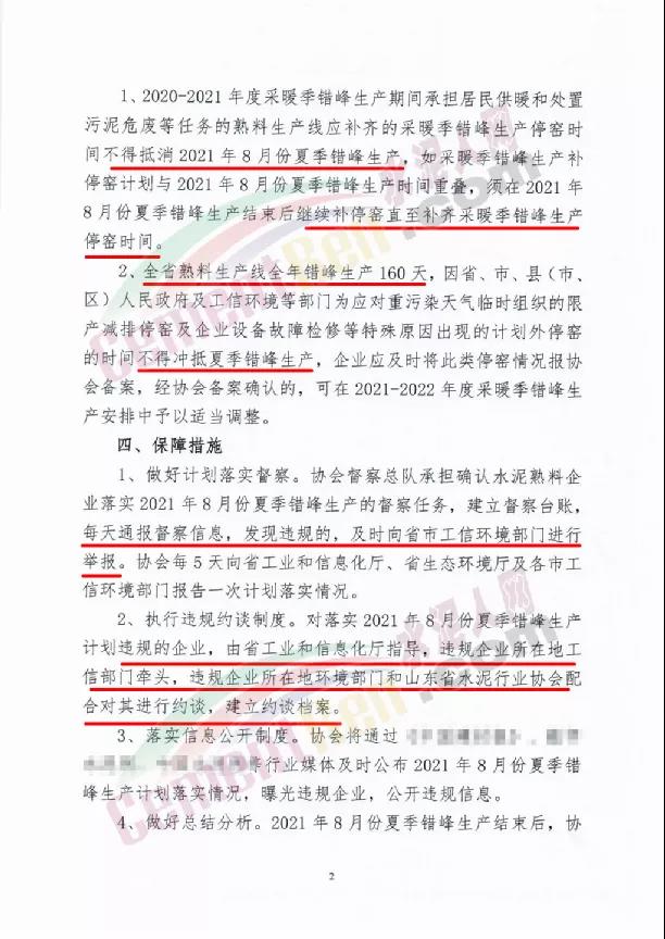 2020-2021年度采暖季錯(cuò)峰生產(chǎn)期間承擔(dān)居民供暖和處置污泥危廢等任務(wù)的熟料生產(chǎn)線應(yīng)補(bǔ)齊的采暖季錯(cuò)峰生產(chǎn)停窯時(shí)間不得抵消2021年8月份夏季錯(cuò)峰生產(chǎn),如采暖季錯(cuò)峰生產(chǎn)補(bǔ)停窯計(jì)劃與2021年8月份夏季錯(cuò)峰生產(chǎn)時(shí)間重疊,須在2021年8月份夏季錯(cuò)峰生產(chǎn)結(jié)束后繼續(xù)補(bǔ)停窯直至補(bǔ)齊采暖季錯(cuò)峰生產(chǎn)停窯時(shí)間。