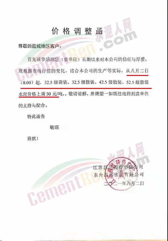 江蘇磊達(dá)水泥通知鹽城地區(qū)客戶,從8月2日8時起,32.5級、42.5級水泥價格上調(diào)30元/噸。