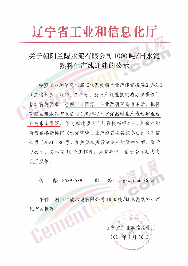 7月30日,遼寧省工信廳發(fā)布關(guān)于朝陽(yáng)蘭陵水泥有限公司1000噸/日水泥熟料生產(chǎn)線遷建的公示。方案經(jīng)朝陽(yáng)市同意、企業(yè)和葫蘆島市申請(qǐng),擬將朝陽(yáng)蘭陵水泥有限公司1000噸/日水泥熟料生產(chǎn)線遷建至葫蘆島市南票區(qū),原址生產(chǎn)線計(jì)劃在2023年10月25日關(guān)停,公示如下: