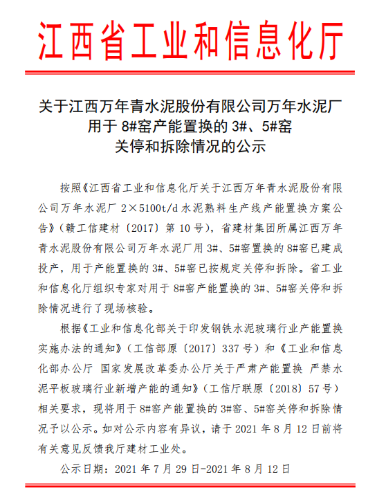 同期,江西省工業(yè)和信息化廳發(fā)布《關(guān)于江西萬年青水泥股份有限公司萬年水泥廠用于8#窯產(chǎn)能置換的3#、5#窯關(guān)停和拆除的公示》稱,按照《江西省工業(yè)和信息化廳關(guān)于江西萬年青水泥股份有限公司萬年水泥廠2×5100t/d水泥熟料生產(chǎn)線產(chǎn)能置換方案公告》(贛工信建材〔2017〕第10號),省建材集團所屬江西萬年青水泥股份有限公司萬年水泥廠用3#、5#窯置換的8#窯已建成投產(chǎn),用于產(chǎn)能置換的3#、5#窯已按規(guī)定關(guān)停和拆除。省工業(yè)和信息化廳組織專家對用于8#窯產(chǎn)能置換的3#、5#窯關(guān)停和拆除情況進行了現(xiàn)場核驗。