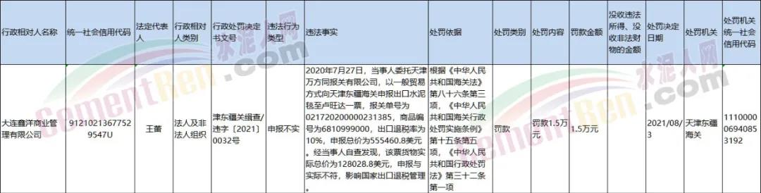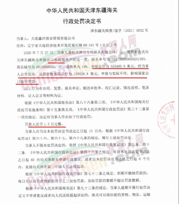 日前天津海關(guān)發(fā)布行政處罰決定書,其中提到出口水泥毯申請與實(shí)際不符,影響國家出品退稅管理被處罰人民幣1.5萬元。