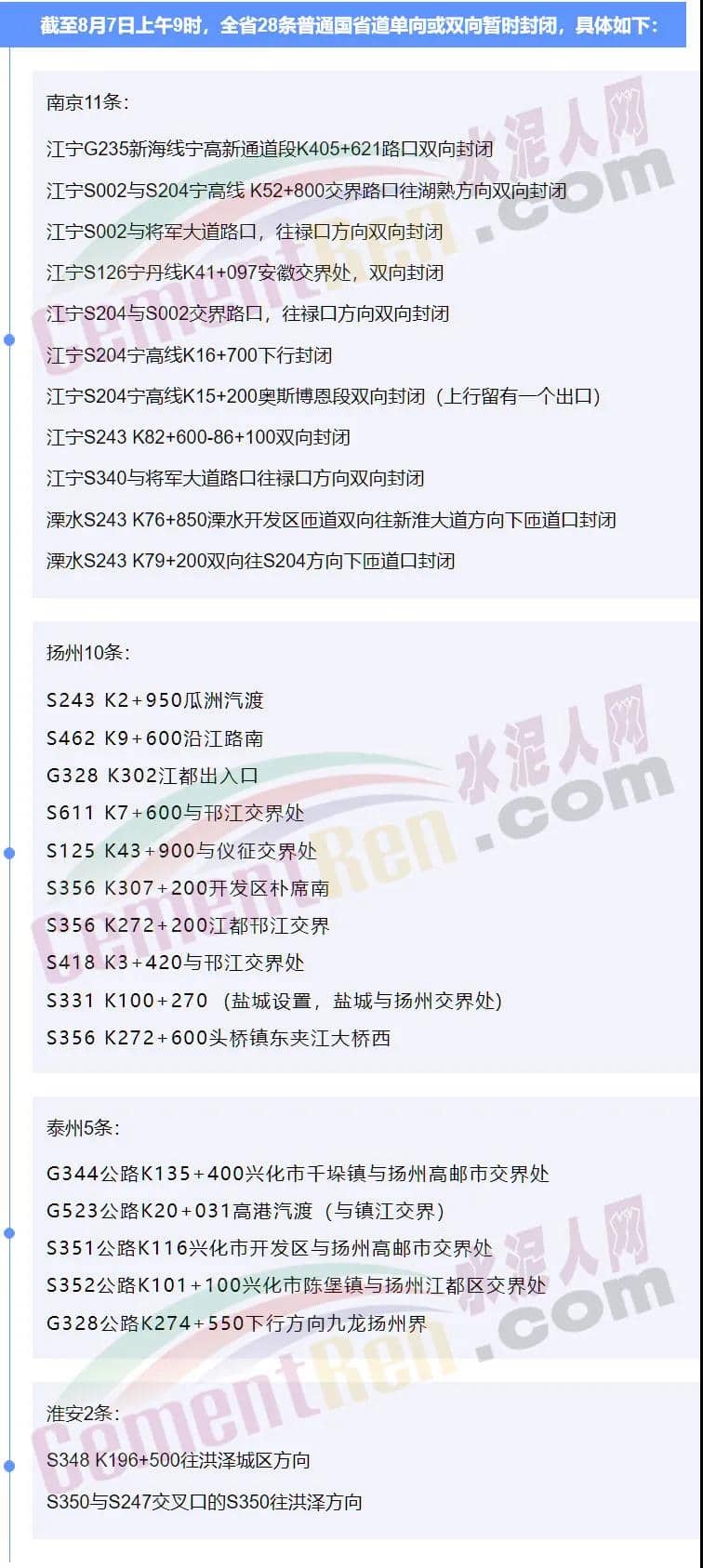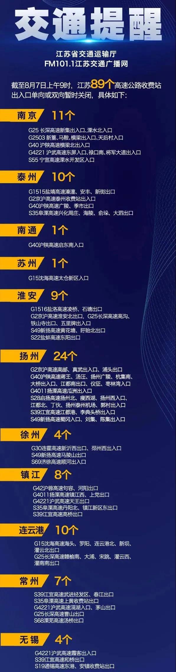 據(jù)江蘇省交通運(yùn)輸廳報(bào)道,全省高速公路運(yùn)行總體平穩(wěn)。截至8月7日上午9時(shí),南京、泰州、南通、蘇州、淮安、揚(yáng)州、徐州、鎮(zhèn)江、連云港、常州、無錫等地區(qū)89個(gè)高速公路收費(fèi)站出入口單向或雙向暫時(shí)關(guān)閉。全省28條普通國(guó)省道單向或雙向暫時(shí)封閉。