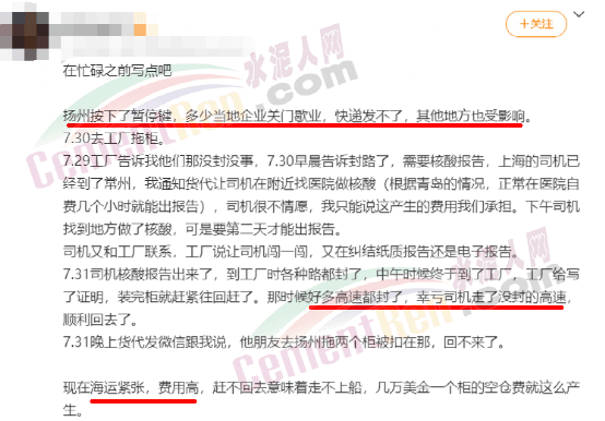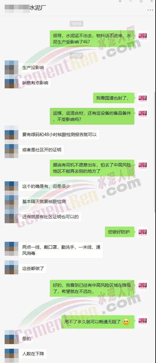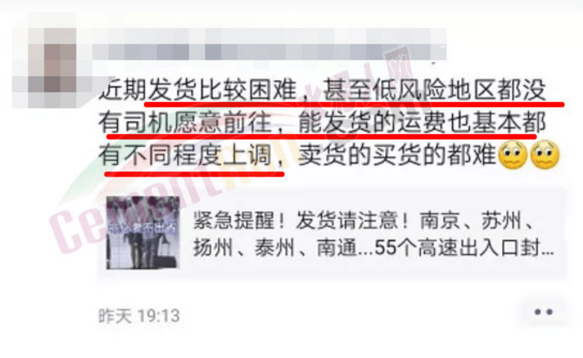 最近江蘇多地為防疫情擴(kuò)散,采取部分路段封路及加強(qiáng)核酸檢測(cè)查驗(yàn)的措施,造成多地水泥企業(yè)運(yùn)輸受到一定的影響。有經(jīng)銷商企業(yè)反應(yīng)部分區(qū)域運(yùn)費(fèi)上漲了50%-60%,貨車司機(jī)也很難找,加上出不了貨,部分企業(yè)庫(kù)滿,已有個(gè)別企業(yè)計(jì)劃近期停限產(chǎn)。部分大廠前期有儲(chǔ)備物料,暫時(shí)對(duì)生產(chǎn)沒有大的影響,僅對(duì)銷售物流有些影響。