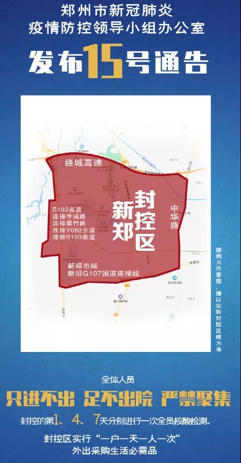 鄭州發(fā)布2021年15號(hào)通告將新鄭市域內(nèi)新舊G107國(guó)道連接線以北、S103省道連接李誡路連接翠竹路連接Y062鄉(xiāng)道連接S103省道以東、繞城高速以南、中華路以西區(qū)域內(nèi)的居民小區(qū)調(diào)整為封控區(qū)。封控區(qū)內(nèi)全體人員實(shí)行“只進(jìn)不出、足不出院、嚴(yán)禁聚集”管理措施,封控的第1、4、7天分別進(jìn)行一次全員核酸檢測(cè)。