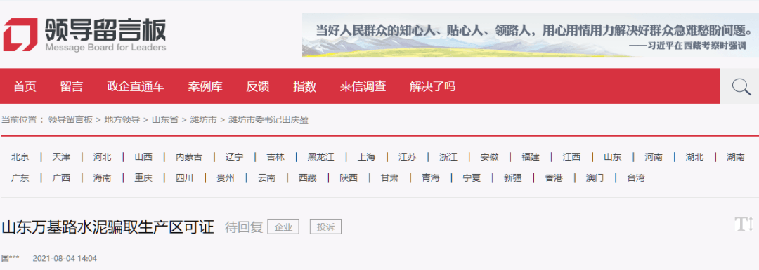 8月4日,有網友在人民網領導留言板給山東省濰坊市委書記田慶盈留言提到,山東萬基路水泥有限公司在沒有任何水泥產能指標的前提下,于2020年8月進行“生料輥壓機終粉磨“項目的申報,但高密審批局最終以建設普通水泥磨機的內容進行審批,如此嚴格限制產能的行業(yè),光明正大的偷梁換柱,并正常經營。全文如下: