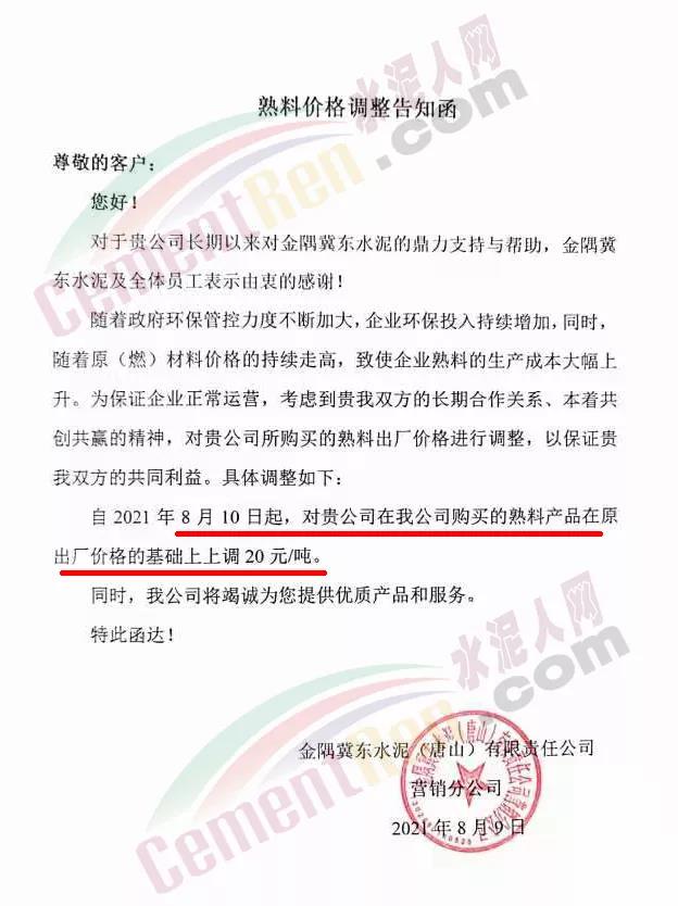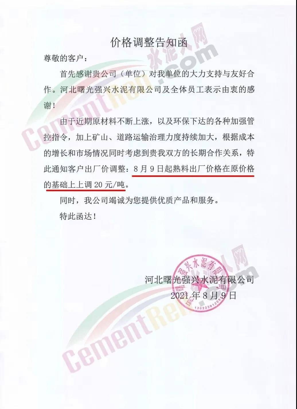 河北曙光強(qiáng)興水泥有限公司通知,由于近期原材料不斷上漲,以及環(huán)保下達(dá)的各種加強(qiáng)管控指令,加上礦山、道路運(yùn)輸治理力度持續(xù)加大,根據(jù)成本的增長(zhǎng)和市場(chǎng)情況,自8月9日起熟料出廠價(jià)格在原價(jià)格的基礎(chǔ)上上調(diào)20元/噸。