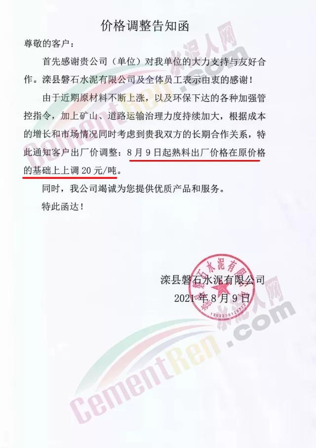 灤縣磐石水泥有限公司通知,由于近期原材料不斷上漲,以及環(huán)保下達(dá)的各種加強(qiáng)管控指令,加上礦山、道路運(yùn)輸治理力度持續(xù)加大,根據(jù)成本的增長(zhǎng)和市場(chǎng)情況自8月9日起熟料出廠價(jià)格在原價(jià)格的基礎(chǔ)上上調(diào)20元/噸。