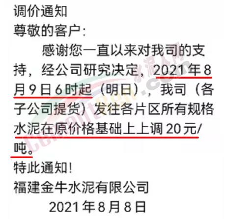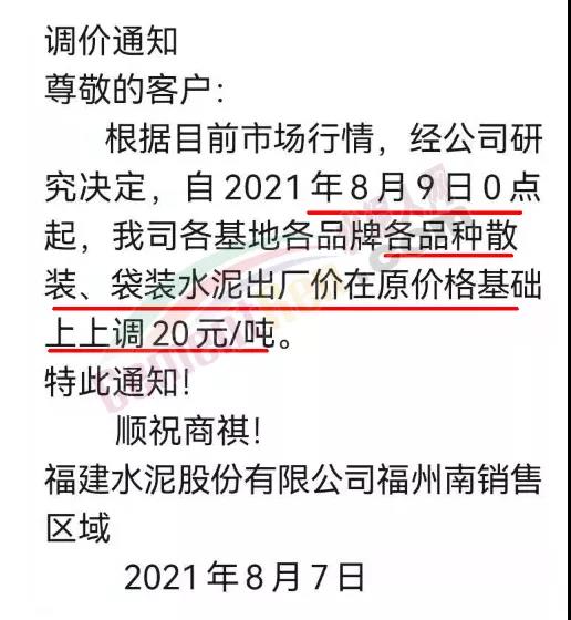 同日福建省內(nèi)福建水泥、金牛水泥等多家企業(yè)通知自8月9日起上調(diào)水泥價(jià)格20元/噸。