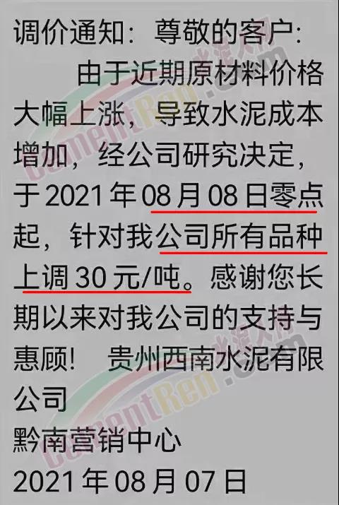 貴州西南水泥有限公司黔南營(yíng)銷中心通知,由于近期原材料價(jià)格大幅上漲,導(dǎo)致水泥成本增加,經(jīng)公司研究決定8月8日零點(diǎn)起,所有品種上調(diào)30元/噸。
